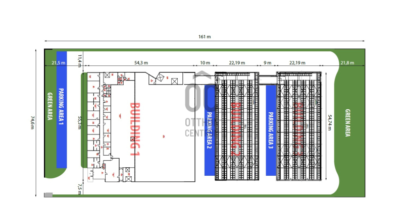 A raktárépületek az irodaház mögött helyezkednek el, külön bejáratokkal. Az irodaház részben 11 különálló irodahelyiség található, átlagosan 20 m² alapterülettel, valamint 5 szociális helyiség is kialakításra került.