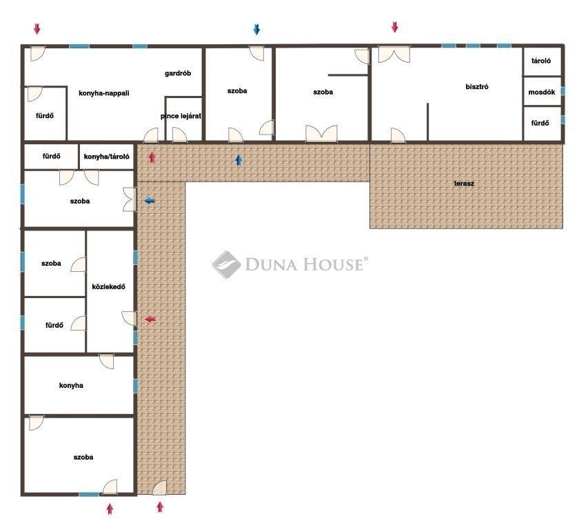Elhelyezkedése központi, igazán egyedi, több irányból megközelíthető. A főútról van nagykapu a kertbe, illetve az egyik lakrész nyílik még ide, ez is akár üzletnek is kiválóan alkalmas. A belső utcáról nyílik a Bisztró és a másik lakrész, ezen az oldalon több autó számára is biztosított a parkolás.