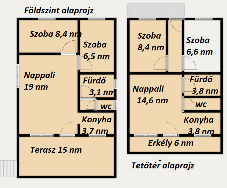 Mindkét szinten nappali, 2 szoba , fürdőszoba, külön illemhely, konyha került kialakításra.