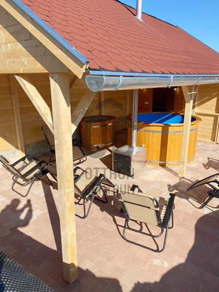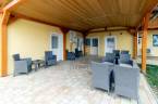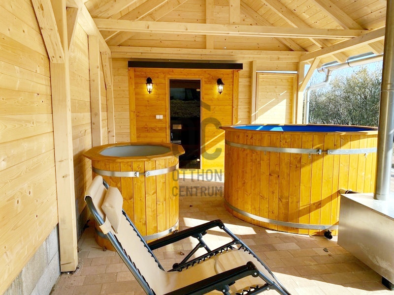 Udvari helyiségek: egy bicikli tároló, két állásos garázs, wellness részleg sóterápiás szaunával és dézsafürdővel.