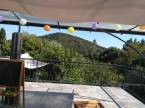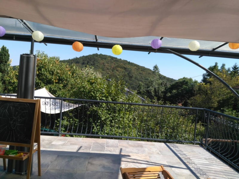 A 40 m²-es terasz 2018-ban új burkolatot kapott, kőhatású lapokkal – innen is panorámás kilátás nyílik, tökéletes hely egy reggeli kávéhoz vagy esti borozáshoz.