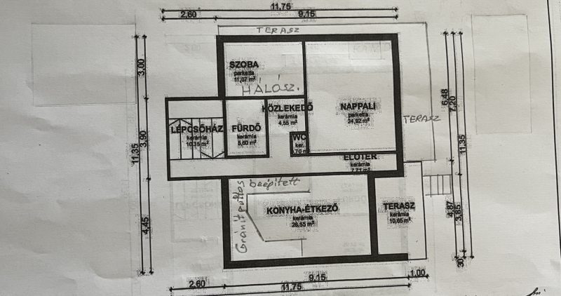 A főépület 350 m², amelyhez 30 m² műhely-garázs, 25 m² fedett terasz és 12 m² napozóterasz kapcsolódik. A teljes beépített terület meghaladja a 400 m²-t, így a terek kényelmesen kiszolgálnak akár két generációt is.