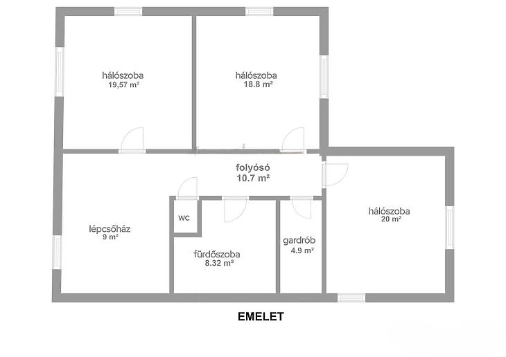 Magasföldszint: tágas, amerikai konyhás nappali (innen nyílik a nagy terasz), fürdőszoba és külön mellékhelyiség, közlekedő és lépcsőház.