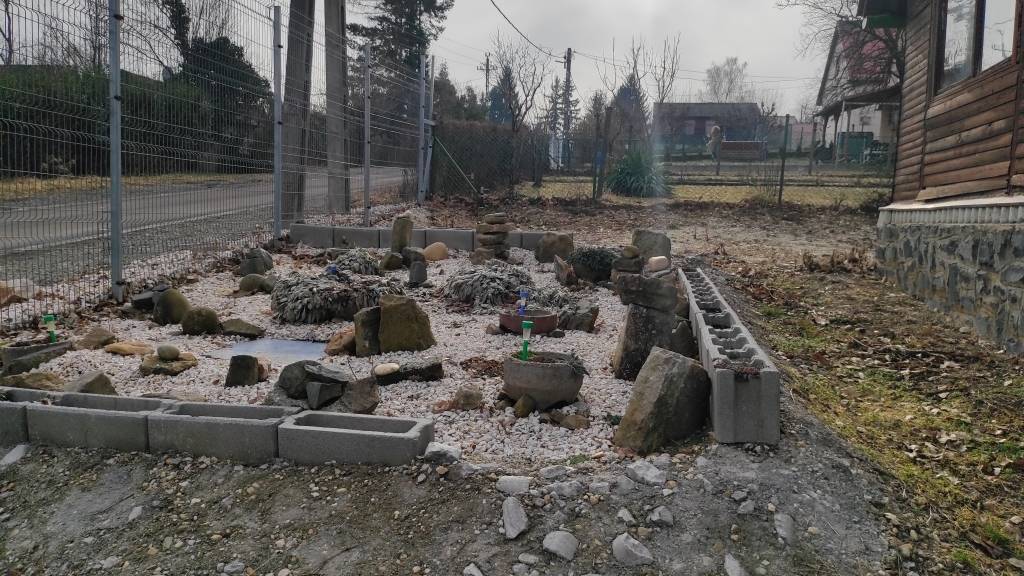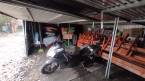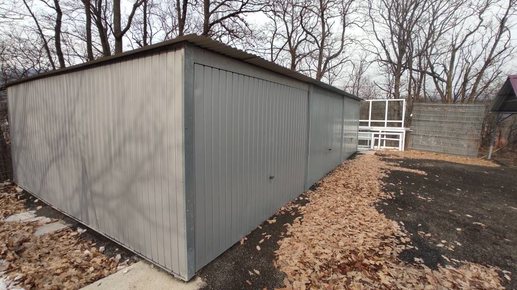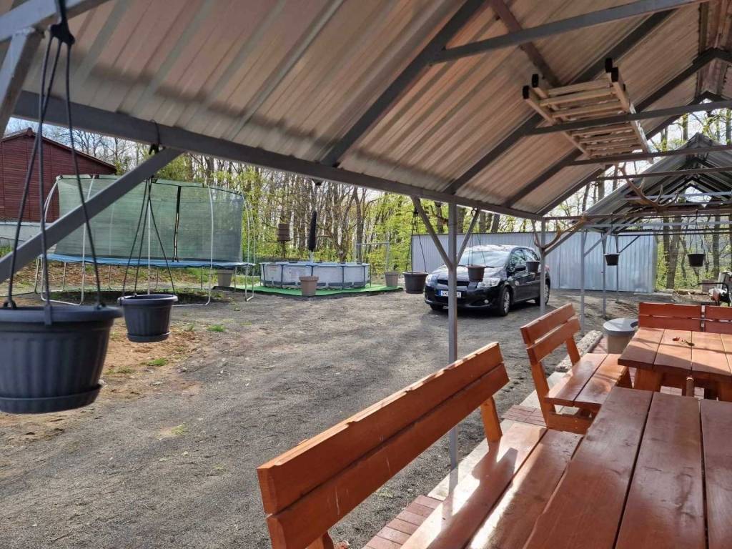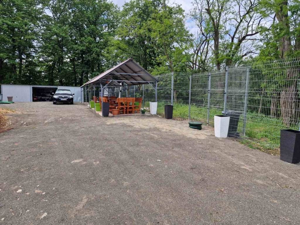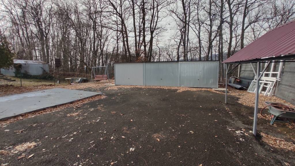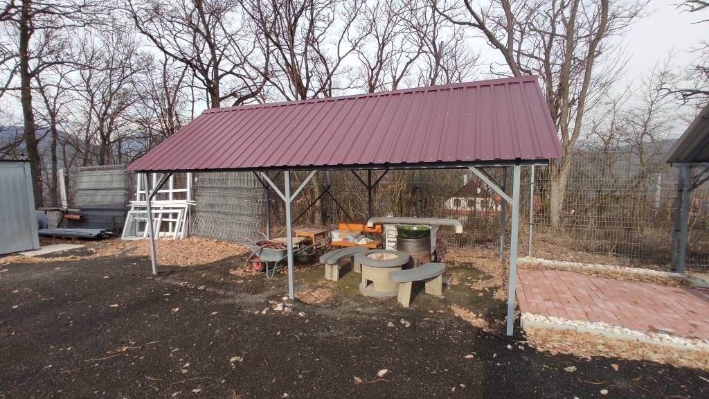 A telken 3 db különálló új fémgarázs, ízlésesen kialakított kiülők, szalonnasütő, kis sziklakert és medence beton alap is található.