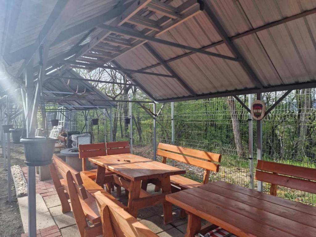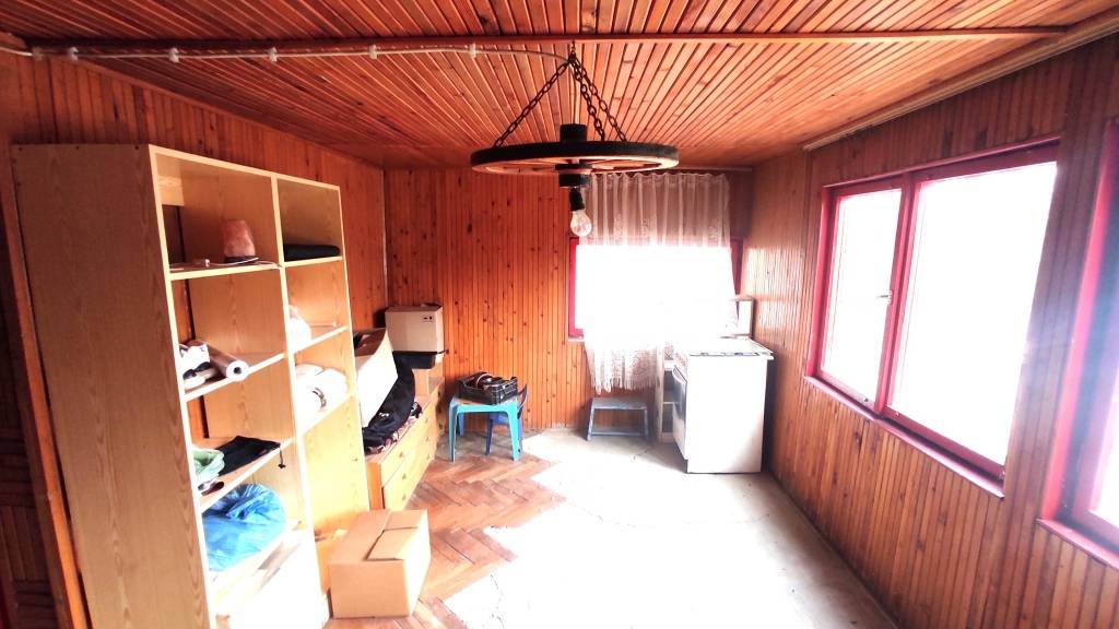 Az ingatlanon egy kő alapzatú, három plusz egy szintes, felújítandó erkélyes faház -többek közt-fürdőszobával és garázzsal, további három darab mobil garázs+ két fedett pihenőhely található.