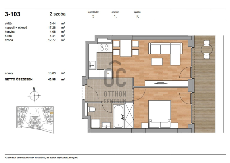 Az ingatlan nettó alapterülete 43,98 m² + 10,03 m² terasz.