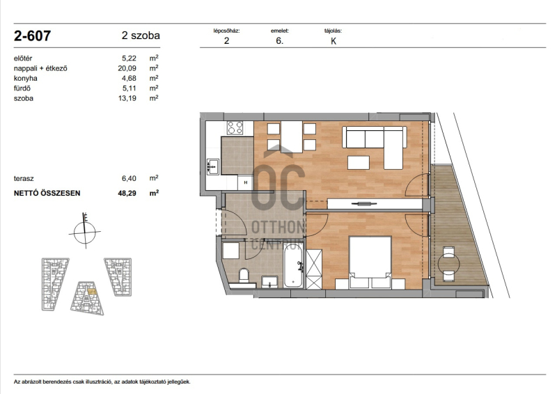 Az ingatlan nettó alapterülete 48,29 m² + 6,40 m² terasz.