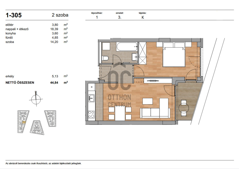 Az ingatlan nettó alapterülete 44,84 m² + 5,13 m² terasz.