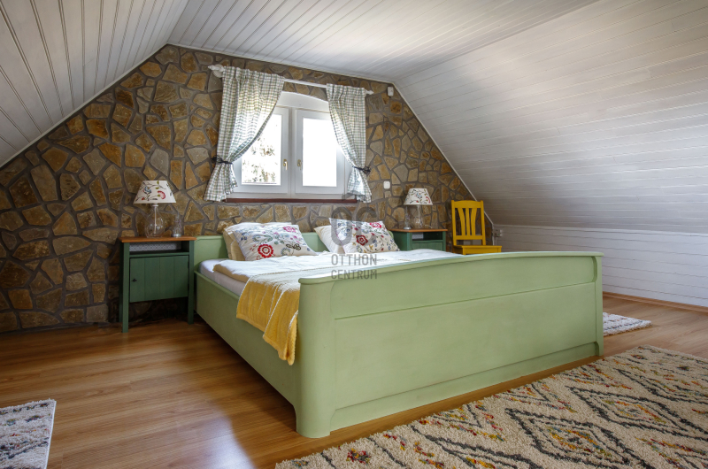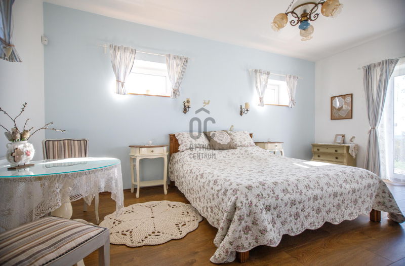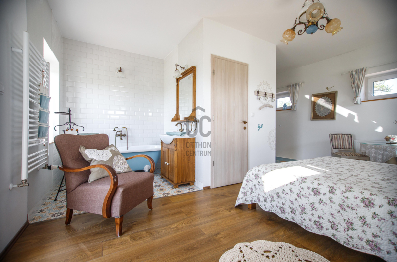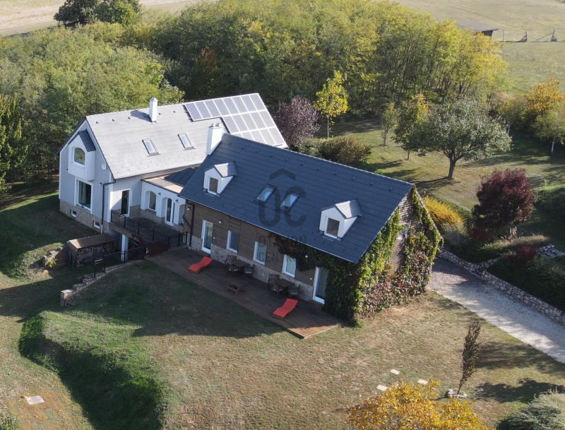 - 2014-ben épített hőszigetelt tégla lakóingatlan, melynek össz nettó alapterülete 366 m2 (Fsz+Tetőtér+Télikert+Pince). Ebből a saját lakórész: Amerikai konyhás nappali, plusz 5 hálószoba, 2 fürdőszoba, háztartási helyiség. Panoráma ablakok, cserépkályha teszik nagyon egyedivé és hangulatossá. A vendégrészben: 4 darab saját fürdőszobás apartman. Elektromos és vegyes tüzelésű kazán, melyeket egy nagy méretű puffer tartály egészít ki, plusz légkondik.