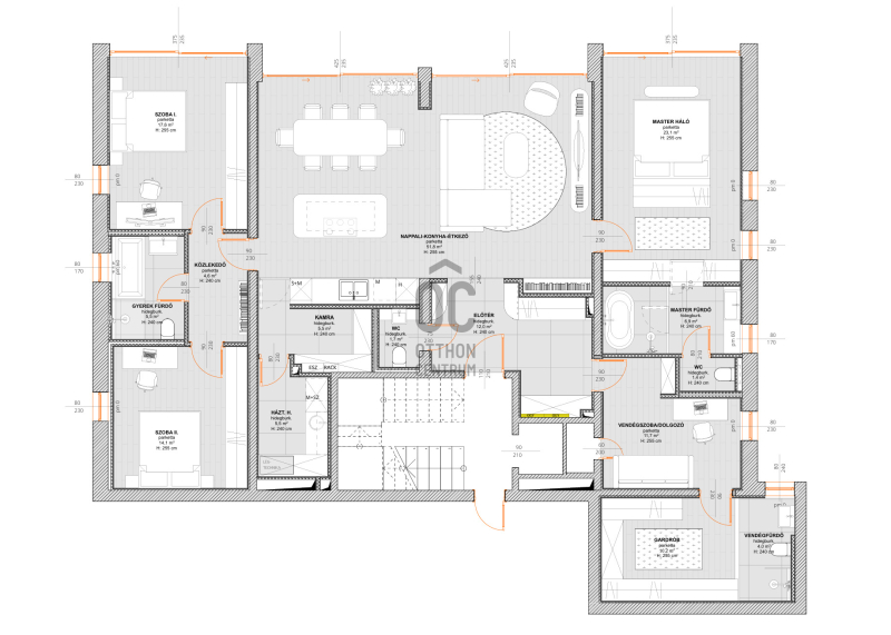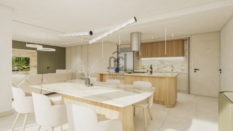 A lakás elrendezése minden igényt kiszolgál: nappali-étkező-konyha egyben, négy hálószoba, három fürdő, vendégmosdó, gardrób és háztartási helyiség. Az átgondolt beosztás biztosítja, hogy a közös élmények és a privát szféra tökéletes egyensúlyban legyenek.