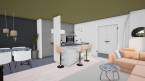 A földszinten elhelyezett étkezőkonyha és nappali összesített alapterülete meghaladja a 26 m2-t. A nappali mérete