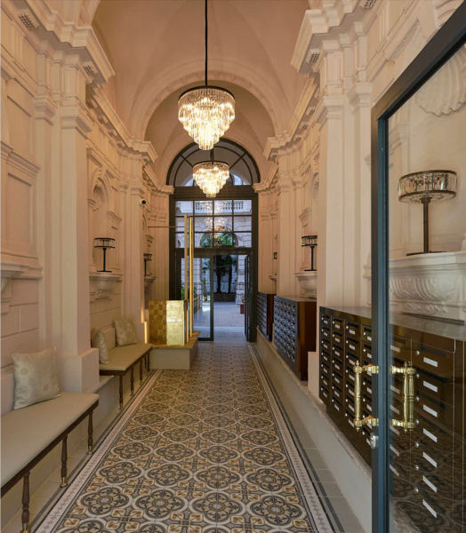A felújított épület minden részlete a mesteri eleganciát tükrözi: márványburkolatok, míves kőfaragások, lenyűgöző homlokzat és négy különleges belső kert várja a lakókat.