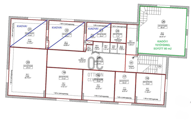 - A hirdetésben található iroda 80 m2 alapterületű, a szintrajzon a 26. számú.