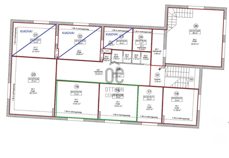- A hirdetésben található iroda 32 m2 alapterületű, a szintrajzon a 18, 19. számú együtt.