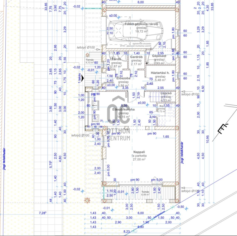 A 124 négyzetméteres ikerház egy 230 négyzetméteres telken helyezkedik el, amely elegendő teret biztosít a kényelmes élethez.
