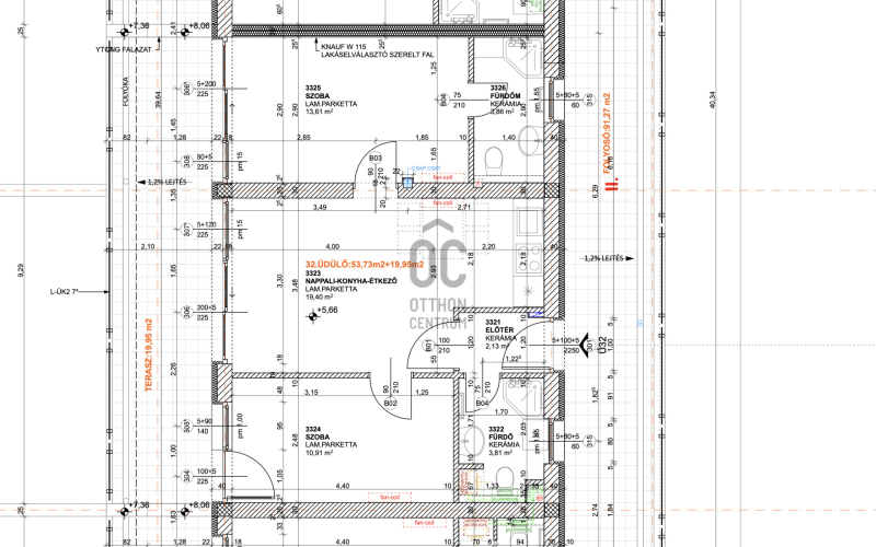 Elosztása - 2 hálószoba, tágas nappali, amerikai konyha-étkező, 2 fürdőszoba, 20 nm-es teraszkapcsolattal.