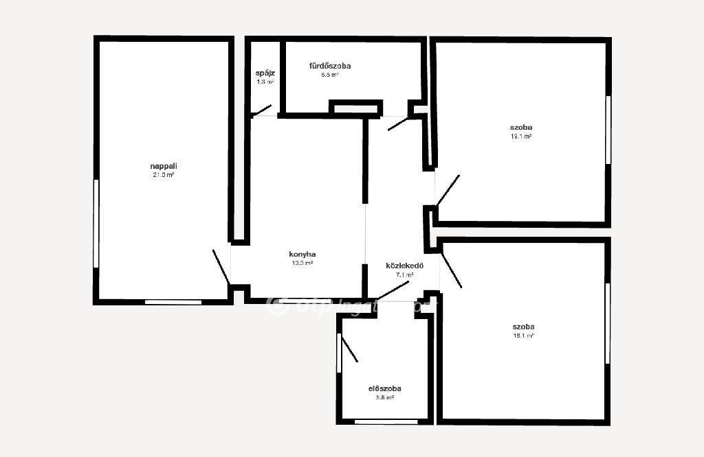A ház elrendezése praktikus és tágas: nappali + étkező ,konyha, két hálószoba, fürdőszoba és WC egyben, előszoba. A szobákban laminált padló, a többi helyiségben járólap található.