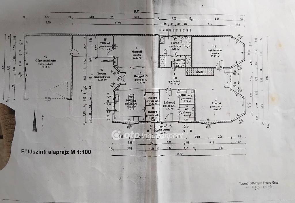 Az ingatlan két szinttel rendelkezik. A földszinten találunk egy szobát, étkezőt, fürdőszobát, külön bejáratú mellékhelyiséget, gardrób szobát, kamrát, tárolót és egy nappali konyhát. Innen egy kijáraton át a 13 nm-es télikertbe, majd a 43 nm-es garázson keresztül a 20 nm-es melléképületbe jutunk.