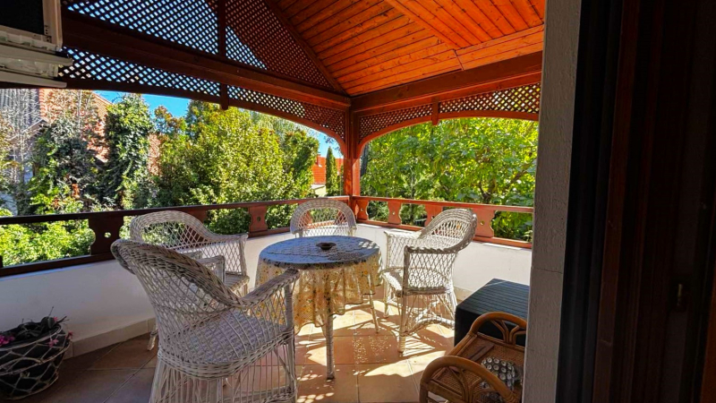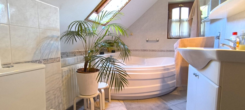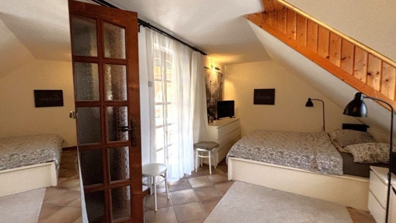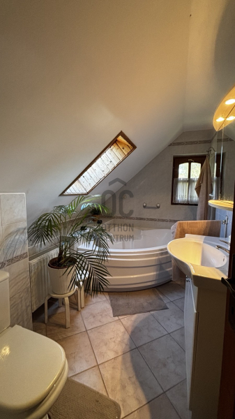 - az emeletre tölgyfa lépcső vezet, itt 3 hálószoba kapott helyet,( 1 szoba közvetlen erkélykapcsolattal ) fürdőszoba, áll a lakók rendelkezésére.