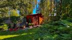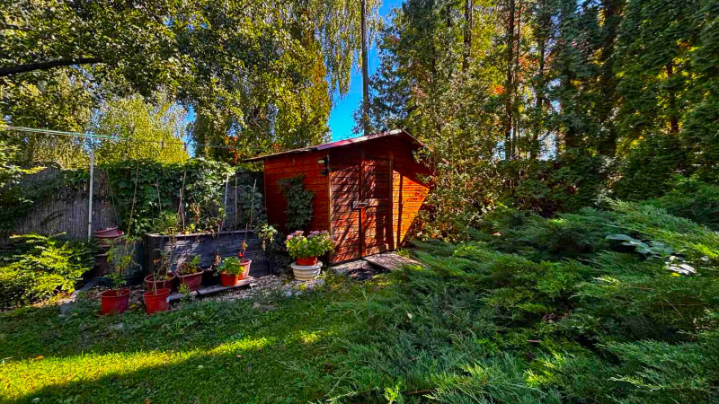A dísznövények,örökzöldek ölelésében kerti faház, tároló található, a növények öntözése fúrt kútból megoldott .