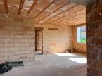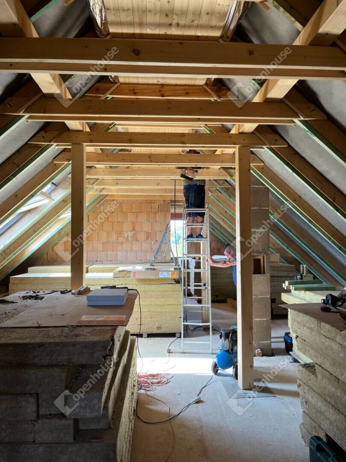 A teraszról egy impozáns lépcső vezet az emeletre, ahol 1-2 hálószoba, fürdő, WC, háztartási helyiség, valamint egy tágas közösségi tér alakítható ki. A kivitelezés során elkészül a belső vakolás, estrich beton, a tetőszerkezet hőszigetelése és lambériázása.