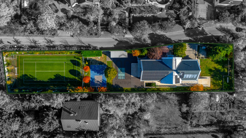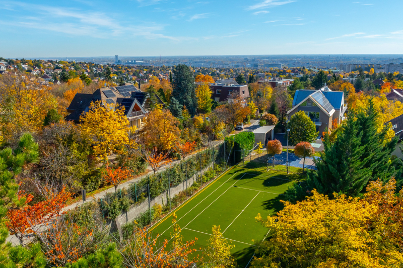 A tágas, parkosított kertben két különleges érték kapott helyet: egy teljes méretű teniszpálya és egy saját kosárlabdapálya, reflektorvilágítással.