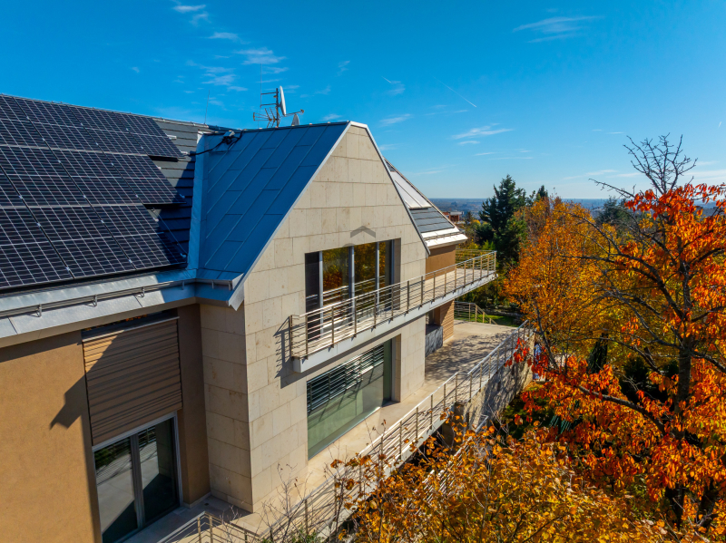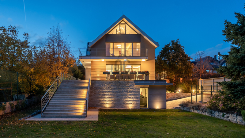 A XII. kerület erdőszegélyén, dombtetőn áll ez a 775 m²-es, négyszintes, déli tájolású családi villa egy ~2200 m²-es telken.