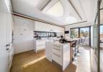 A konyha–étkező a ház szíve: letisztult frontok, tömör dió sziget, rejtett tárolók és prémium gépek.