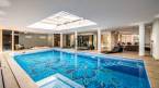 A wellness-szint a feltöltődés tere: mozaikos, virágmotívumos medence üvegtetővel, szauna, jacuzzi, pihenőtér és Technogym-gépekkel felszerelt fitnesz.
