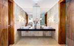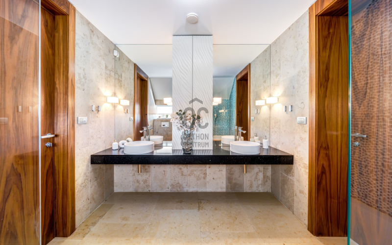 A szülői lakrész külön univerzum: kétoldali gardrób, privát terasz és szobaméretű, panorámás fürdő, ahol kő, fény és víz időtlen egységet alkot.