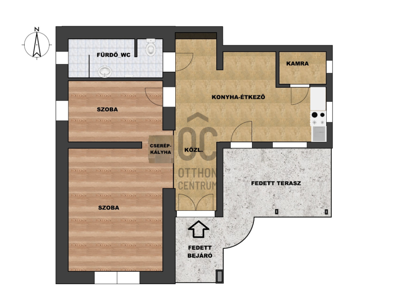 Szobákban laminált parketta, többi helyiségben járólap a padlóburkolat.