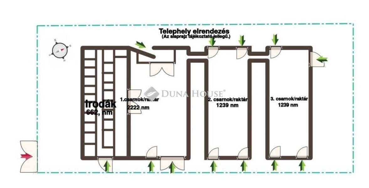 Kamionnal körbejárható ingatlan gyakorlatilag 4 részre osztható, egy irodarészre és 3, átjáróval összekötött raktárcsarnokra, így az épületek fizikailag akár szeparálhatóak. Az ingatlan igény esetén megosztható kettő vagy akár három részre, így 750nm- 5832 nm-ig bérelhető.