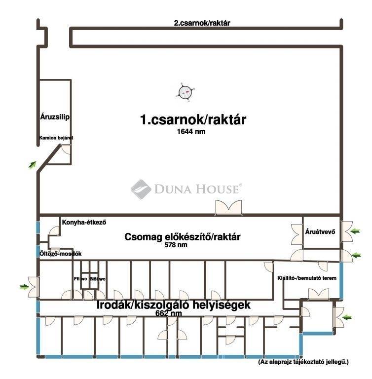1. Irodarész: berendezett irodákkal, öltözővel, mosdókkal, kiszolgáló helyiségekkel: 750 nm, 3,0-4,5 m belmagassággal,