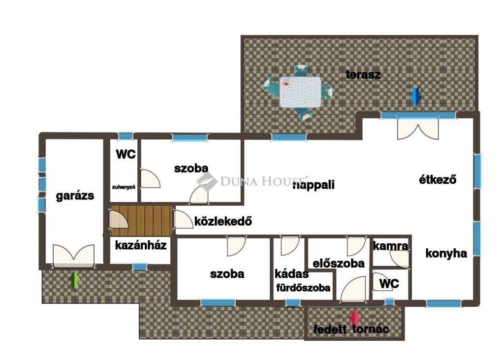 A ház jelenlegi elrendezését egy tágas, 41 m2-es nappali-konyha-étkező, két hálószoba és két fürdőszoba, egy külön vendég WC, egy előszoba, illetve egy garázs és egy kazánház alkotják.