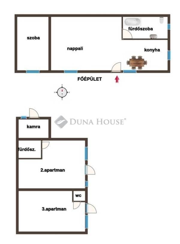 Kecskeméten a Ceglédi útról nyíló egyik kis utcában eladó egy 181 nm-es kis telken, -amely önálló helyrajzi számon nyilvántartott telek,- lakóház, udvar. A telken két régi építésű, tégla alapú, vert vályog falazatú, de teljes mértékben felújított épület van. Az egyik épülethez egy korábbi bővítés már tégla falazattal történt. A két épület összes netto alapterülete 92 nm. Főépület: nappali, + 1 hálószoba , kádas fürdőszobával összesen 52 nm. Az épület fűtéséről egy hordozható, fatüzelésű kályhával történik, valamint egy vadonatúj 3,5 KW-os inverteres klíma van felszerelve. Melléképület: 2 külön bejárattal rendelkező egyenként 18-20 nm-es lakó apartmanok, mindkettőben konyhapulttal és kis fürdőszoba tusolóval van ellátva. Ezekben elektromos fűtőpanellel lehet megoldani a fűtést, de 1-1 kémény is van, kályha is betehető. További tudnivalók: A felújítás alkalmával mindenhol hőszigetelt üvegezésű múanyag ablakok kerültek beépítésre.Mindhárom lakóegység külön-külön mérőórákkal rendelkezik.A főépületen Lindab tető, a melléképületen hullámpala van. A födémek üveggyapot szigetelést kaptak.- víz, és csatornahálózat kicserélve- elektromos hálózat felújítva, csövezve- 3 x 16 Amper,- ipari áram, 380 Volt- az udvar pici, de akár két autóval is be lehet állni- kint egy külső kamra2021-es felújítás!Buszmegálló a közelben!Saját részre, 2 generációnak ajánlom, panel helyett kiváló választás, főleg, he Ön egy kis udvart is szeretne magának! Befektetőknek is ajánlom, hiszen 3 lakóegységgel kiválóan hasznosítható! Keressen, jó választás!