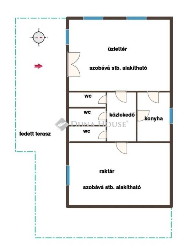 A 67 m2-en kialakításra került:-üzlettér / szobákká, konyhává alakítható/-közlekedő,-konyha,-3 db wc /kialakítható fürdő/.-raktár /szobává alakítható/.Az épülethez nagy fedett terasz csatlakozik. Fűtéséről gázkonvektorok és 2 db cserépkályha gondoskodik. 2015- ben a felújítás során cserélve lettek:- a villany és víz vezetékek,-a tető héjazat lemezre,-a burkolatok,-nyílászárók műanyagra-külső homlokzat színezése.