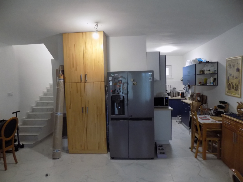 Az alsó szinten a bejárati ajtón belépve egy kis előszobán keresztül jutunk el a nappali-étkező-konyha helyiségbe, melyek egy légtérben vannak, ezenkívül itt még egy fürdőszoba, káddal és egy lépcső alatti tároló is adódik.