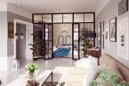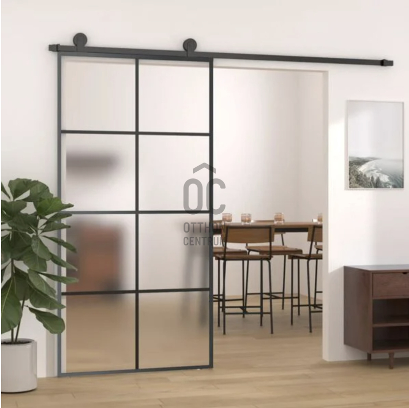 A 36 m²-es otthon hálófülkés kialakítású, így a nappali és a pihenőrész kellemesen elkülönül. A tulajdonos egy elegáns üvegajtós megoldást tervezett a háló leválasztására, ami egyszerre modern és levegős, ugyanakkor jól elkülöníti a tereket — ezt az új tulajdonos igény szerint továbbviheti.