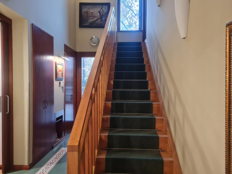 A közlekedőből vezet fel a lépcső az emeletre, ahol egy külön lakrész található fürdőszobával.