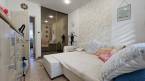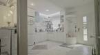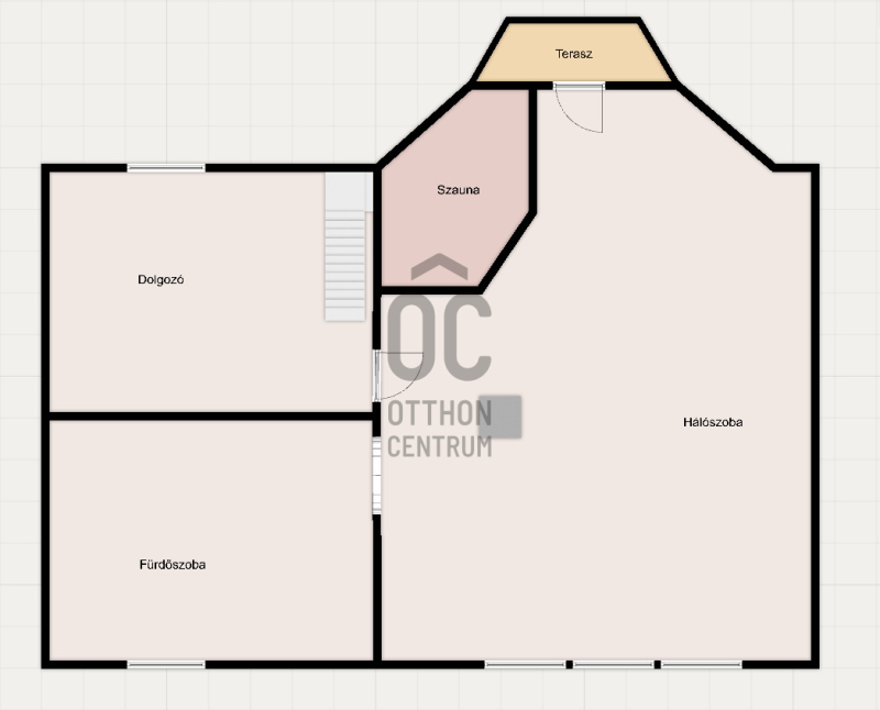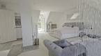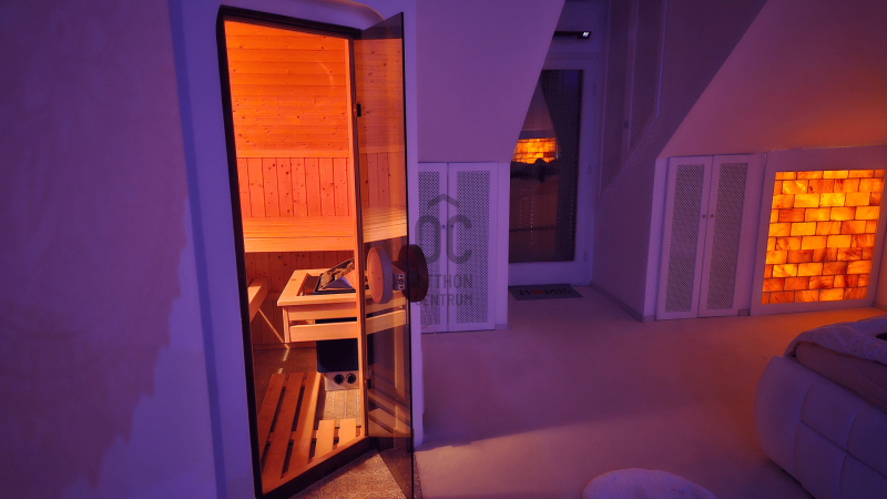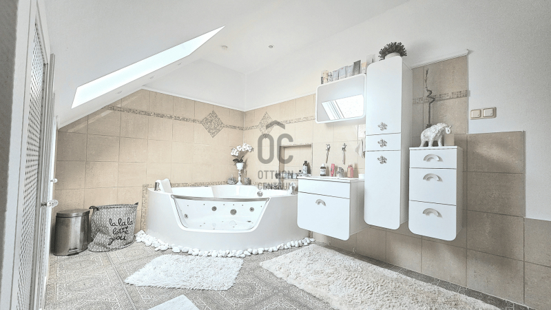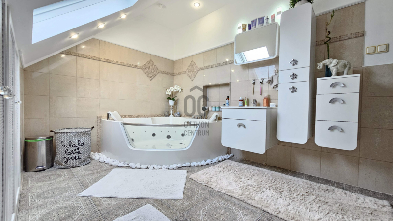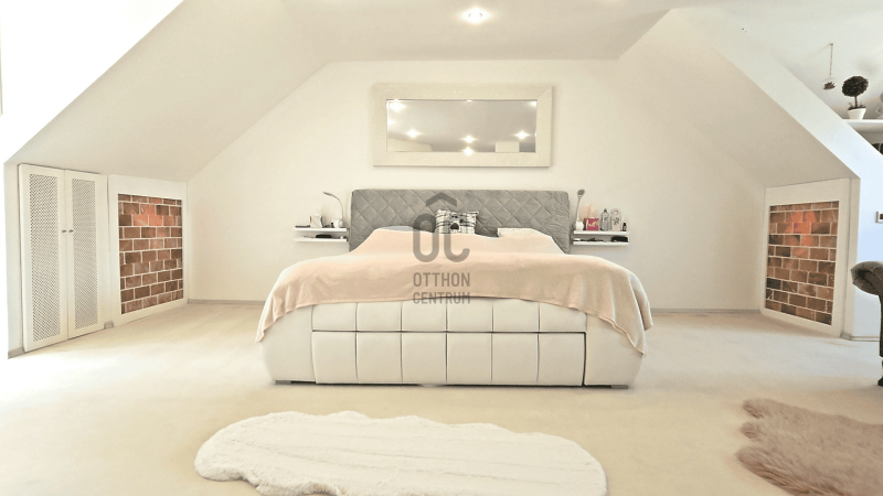 Nagy méretű hálószoba és wellness-jellegű fürdő: jacuzzi, finn szauna, sófal, légtisztító.
