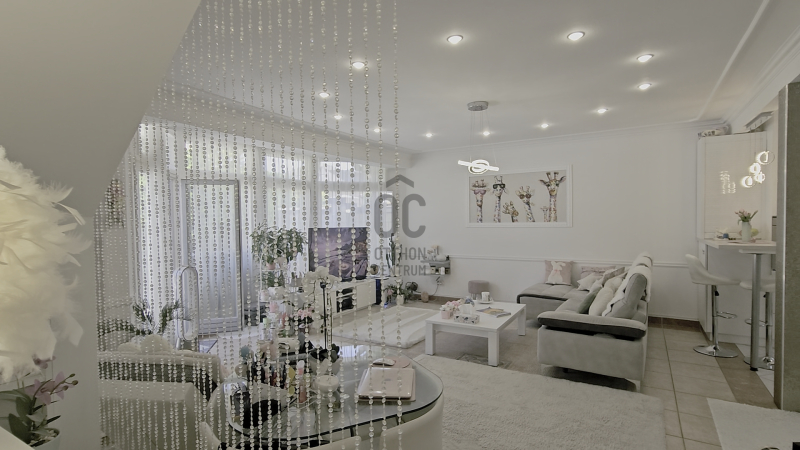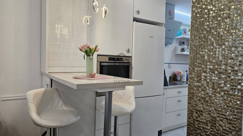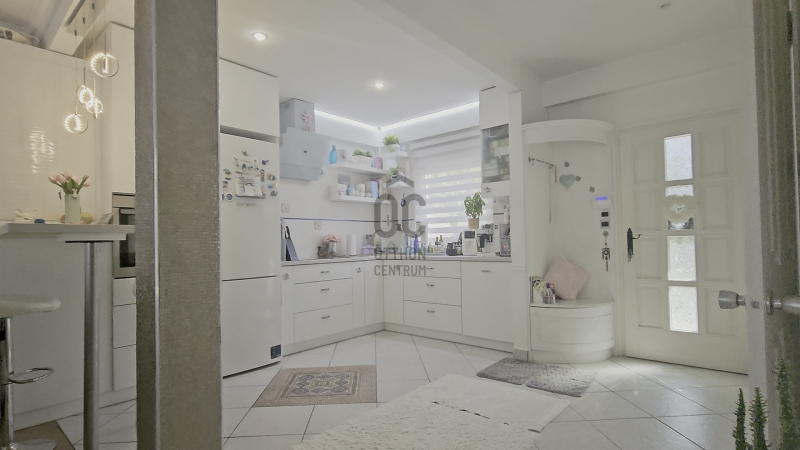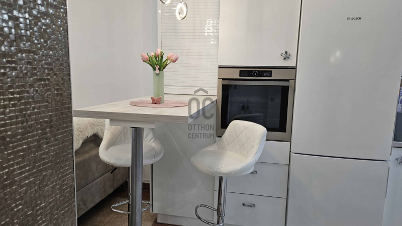 Tágas, világos terekkel rendelkező nappali–étkező–konyha, teljesen gépesített konyhabútorral és minőségi berendezésekkel.