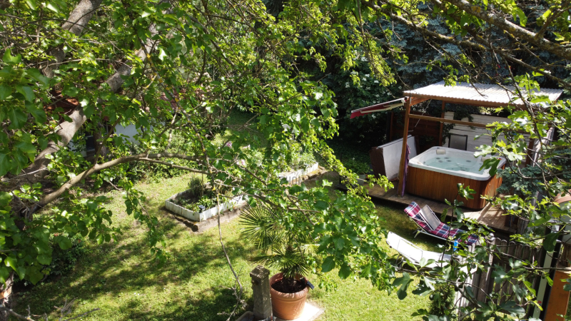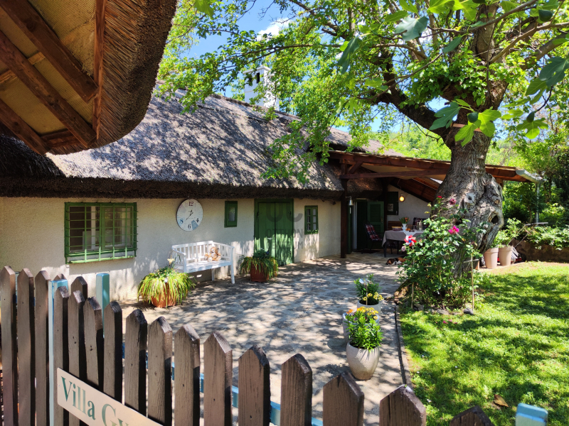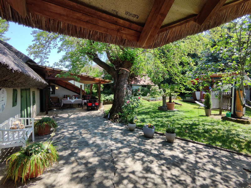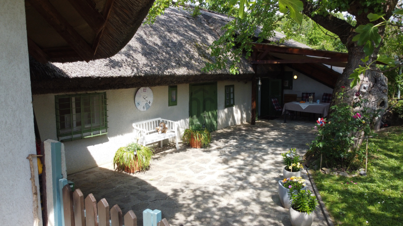 Az udvar teljesen körbe van kerítve, olyan mint egy oázis, reggel a domboldalról, estefelé pedig a Balatontól érkezik a tiszta levegő. Ha relaxálni lenne kedve itt minden adott, a jakuzzival együtt.