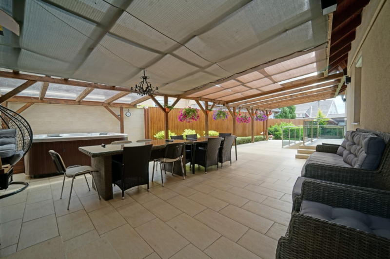 A parkosított kertet öntözőrendszer locsolja helyettünk. A megközelítőleg 70m2-es fedett terasz kiválló helyszíne a családi összejöveteleknek és a pihenésnek. Az itt található jacuzzi is a vételár részét képezi.