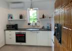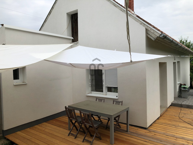 A konyha-étkezőből közvetlenül ki lehet lépni egy kb 40 m2-es fa teraszra. A terasz előtt kb 120 m2 füvesített “piknik” kert található öntözőrendszerrel, szép gyeppel
