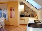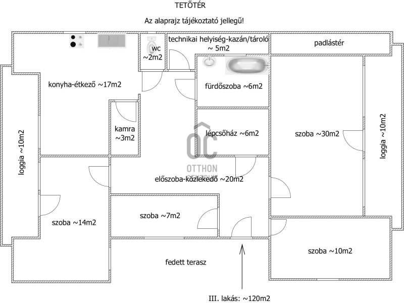A földszinten két lakás található: az egyik kb. 60 m2-es, előszobával, 2 külön nyíló szobával, konyha–étkezővel, kamrával, fürdőszobával és külön WC-vel. A másik kb. 80 m2-es, előszobával, tágas konyha–étkezővel, kamrával, fürdővel, WC-vel és két nagy, külön nyíló szobával. A tetőtéri, kb. 120 m2-es lakásban 2 kisebb és 2 nagyobb szoba (mindkettő loggiával), tágas konyha–étkező, kamra, fürdő, WC és tároló található. A loggiáról kellemes zöldpanoráma nyílik, egészen a Duna töltés erdőségéig.