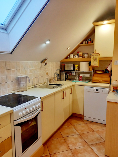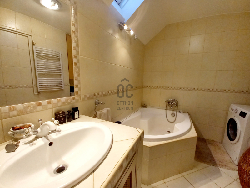 A pinceszinten kb. 140 m2-en szerelőaknás műhely/garázs (korábban autószerelő műhely volt), kazánház/fatároló, nyári konyha, több tároló, pince és a belső lépcsőház kapott helyet. A földszinten a fűtést Westen gázkazán és vegyes tüzelésű kazán biztosítja, a meleg vizet villanybojler adja; a tetőtérben kombi gázkazán gondoskodik a fűtésről és meleg vízről. A házon 2 rétegű műanyag ablakok vannak redőnnyel és szúnyoghálóval. A 3 szint összesen 420 m², a 3 lakás együtt 280 m². Az ingatlan összközműves és tehermentes.