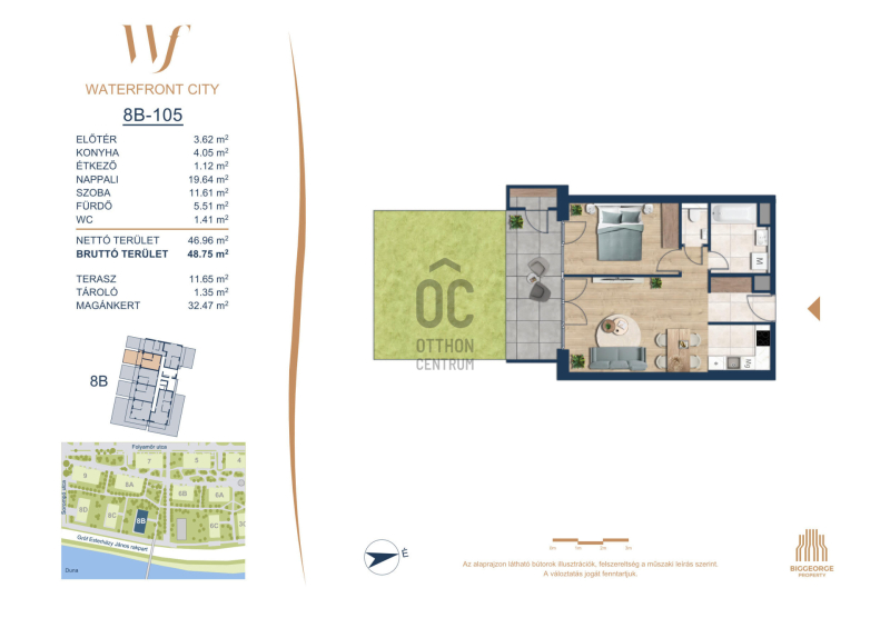 A Waterfront City egy új, modern városnegyed a 3. kerületben, ahol a természet közelsége és a városi kényelem tökéletes egyensúlyban van. A Duna-part közvetlen szomszédságában elhelyezkedő fejlesztés különleges atmoszférát kínál: a sétányt új épületek határolják, üzletekkel, kávézókkal és szolgáltatásokkal, amelyek élhető közösségi teret teremtenek.