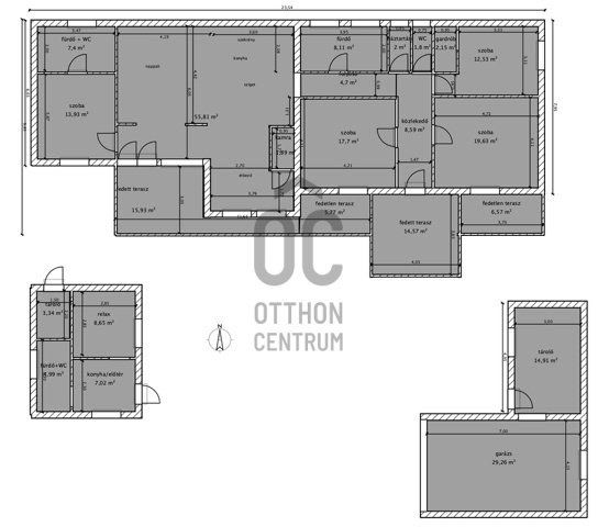 -4 db háló (11,91nm, 17,7nm, 19,63nm, 12,53nm), 2 db fürdő (8,11nm, 7,4nm), 55,81 nm, világos nappali-étkező-konyha, közlekedő, háztartási és gardrób szoba, külön mosdó, fedett teraszok