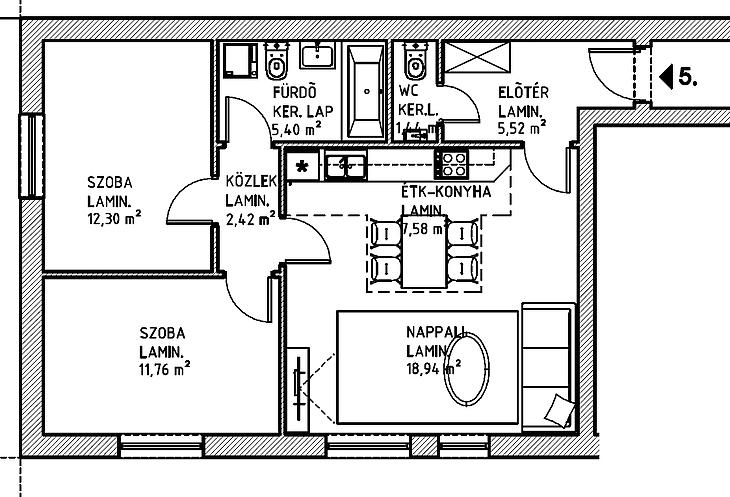 A lakásban tágas amerikai konyhás nappali, 2 szoba, fürdőszoba, előszoba, közlekedő és mellékhelyiség kerül kialakításra.