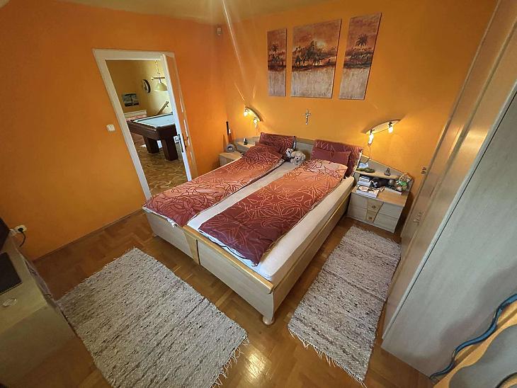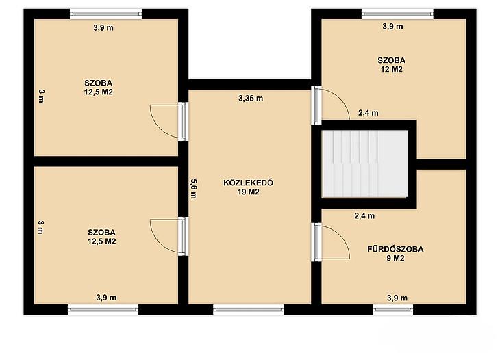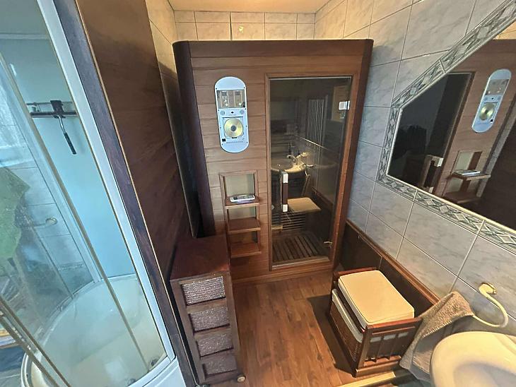 Emelet: 3 szoba, közösségi tér, zuhanyzós fürdőszoba + WC + infra szauna.